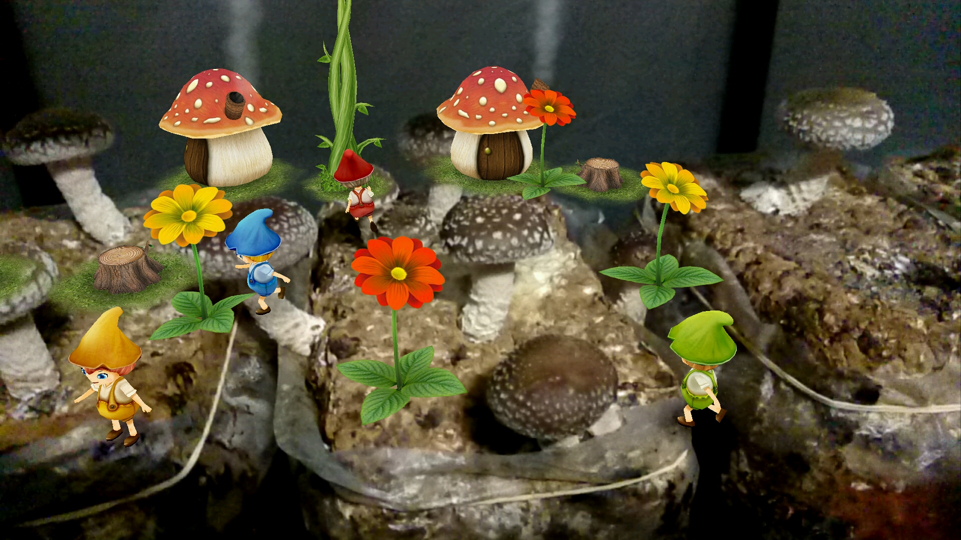 わけわからず、携帯カメラのエフェクト機能をONさせたら、画面がモヤモヤ~ってなり、きのこの妖精達が出てきてびっくりしました❗